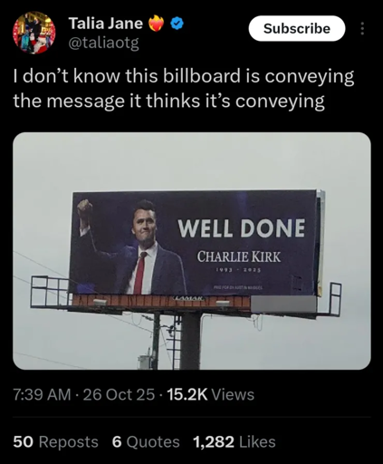 Please, I need a photo of this. I really need a photo of a mall-strip filled with Charlie Kirk memorial fronts leading down to a rifle store. That’s some fucking divine irony especially because HE PROBABLY WOULD BE OKAY WITH IT.